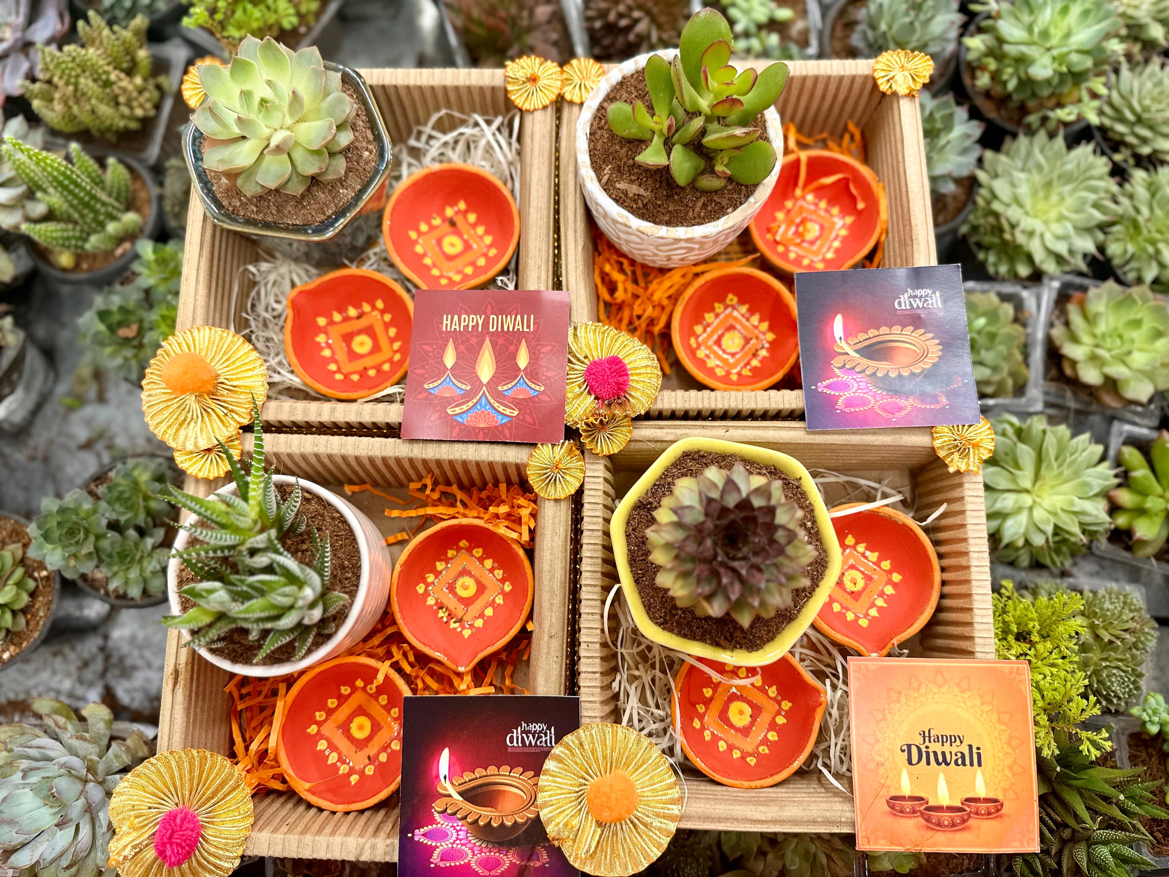 3. Symbolism : Just as the diyas symbolize the triumph of light, a thriving plant in a green hamper symbolizes growth, prosperity, and positivity.