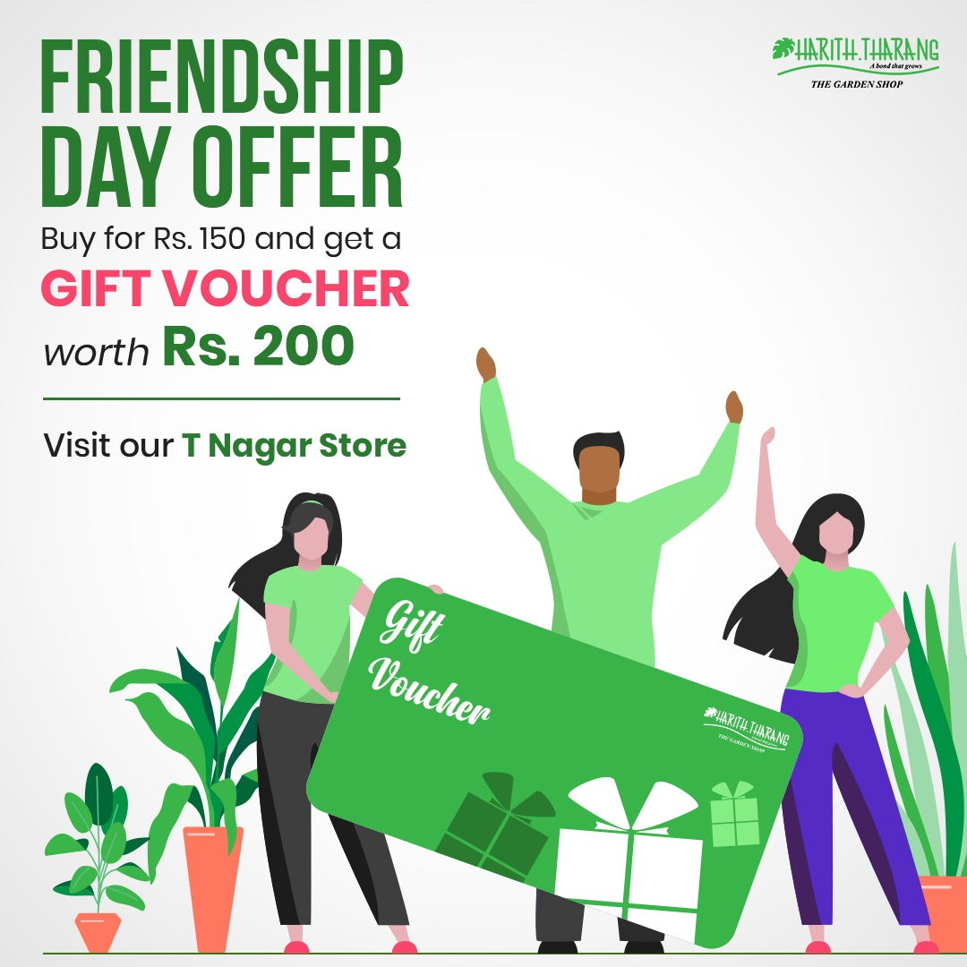 Harith Tharang is giving away Friendship day cards made of seed papers. You can write on the cards and later sow it in a pot with soil. water it regularly and see your friendship bloom right under your nose. Also get a gift voucher of RS.200/- and get all your favorite plants. All this for a bill value of just Rs.150/-. Amazing isn’t it? What are you waiting for? Head to Harith Tharang now. Call 9600120351 now for details. Offer valid only on 30th July 2020. Hurry up folks!