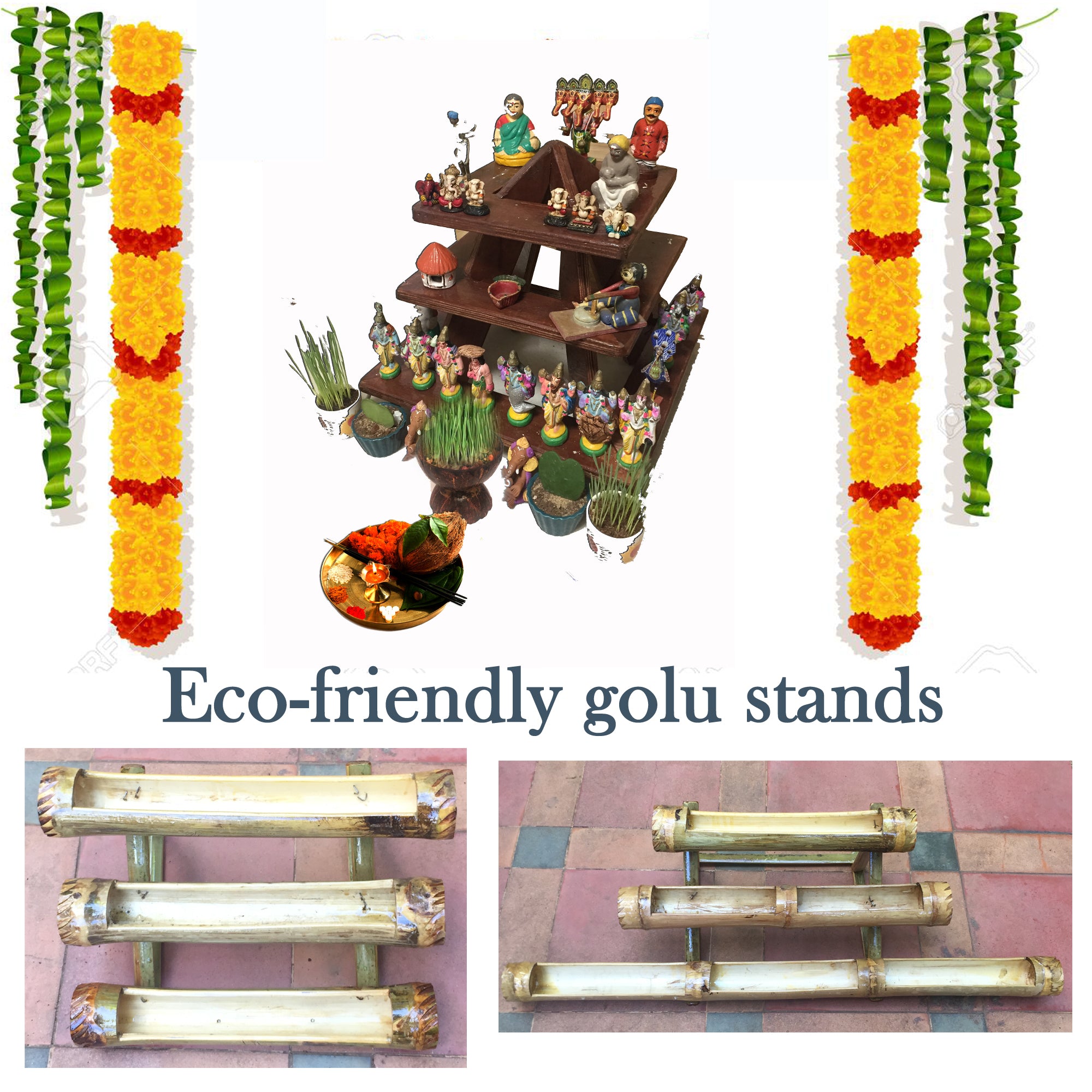 Harith Tharang is a group of landscape designers and architects from Chennai which strives to make eco-friendly products and gifts for festive seasons. Using hand-made products we arrange every items to match the buyer’s requirements, and have a range of eco-friendly Golu Stands made od wood and bamboo to match everyones taste. Also in store are a variety of cute little plants that can serve the purpose of return gifts for navarathri.