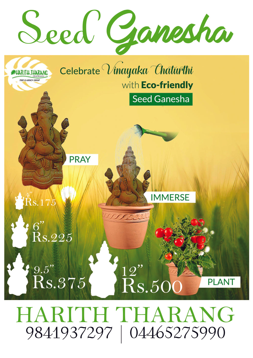 eco-friendly Ganesha idols with plant seeds in them. You can place the idol in a pot with soil at the end of the festival. Water it and the idol begins to dissolve. Soon, the seeds take root in the soil. Visit Harith Tharang to buy one. Located @42, Bazullah Rd, T.Nagar. 9841937297 | 04465275990